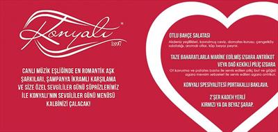Kanyon Konyalı, aşkın en tatlı halinin yaşandığı, romantizmin doruğa çıktığı bu özel günü unutulmaz kılmak için muhteşem bir program hazırladı. Şampanya ikramı ile "merhaba" diyeceğin, şeflerimizin büyük bir özen ve lezzetle hazırladığı, aşk menü'müze, mum ışığında unutulmaz aşk şarkılarından oluşan enstrümantal caz melodileri eşlik edecek. Senin için hazırladığımız özel sürprizlerimiz ile "bu gece hiç bitmesin" diyeceksin.